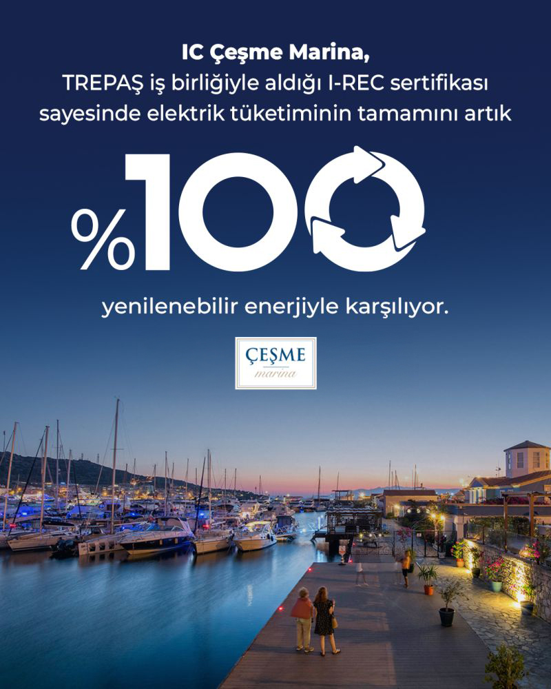 Çeşme Marina, which adopts sustainability as a fundamental principle in its activities and contributes to sustainability with its environmentally friendly practices, has obtained the International Renewable Energy Certificate (I-REC) in 2025, covering its entire annual electricity consumption of 3,414 MWh from renewable energy sources.